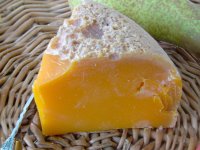 チーズはアナトーという着色料でオレンジ色に色づけされ、若い頃は薄いオレンジ色がだんだんと茶色っぽい渋い